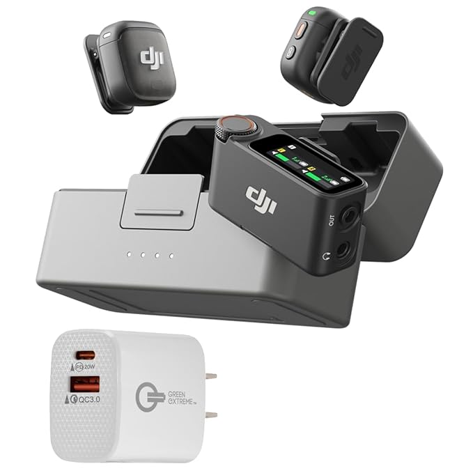 DJI Mic 3 (2 TX + 1 RX + Charging Case), Wireless Microphone for iPhone/Camera/Android, Ultralight, Adaptive Gain Control for Balanced Volume, Dual Band Anti-Interference, Vlog, 2-Port Wall Charger
