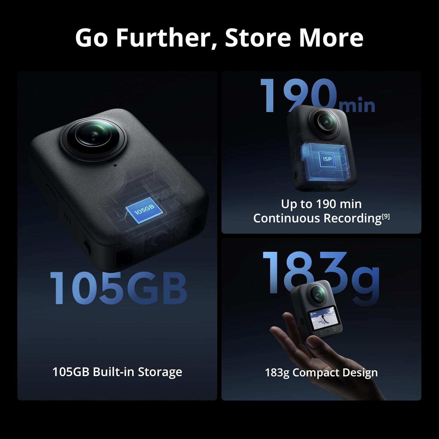 Next-Level 8K Performance – Keep the action going with your 360 camera supporting 8K/30fps videos for up to 100 minutes [4] nonstop. For every adventure or event, your action camera never misses a beat.