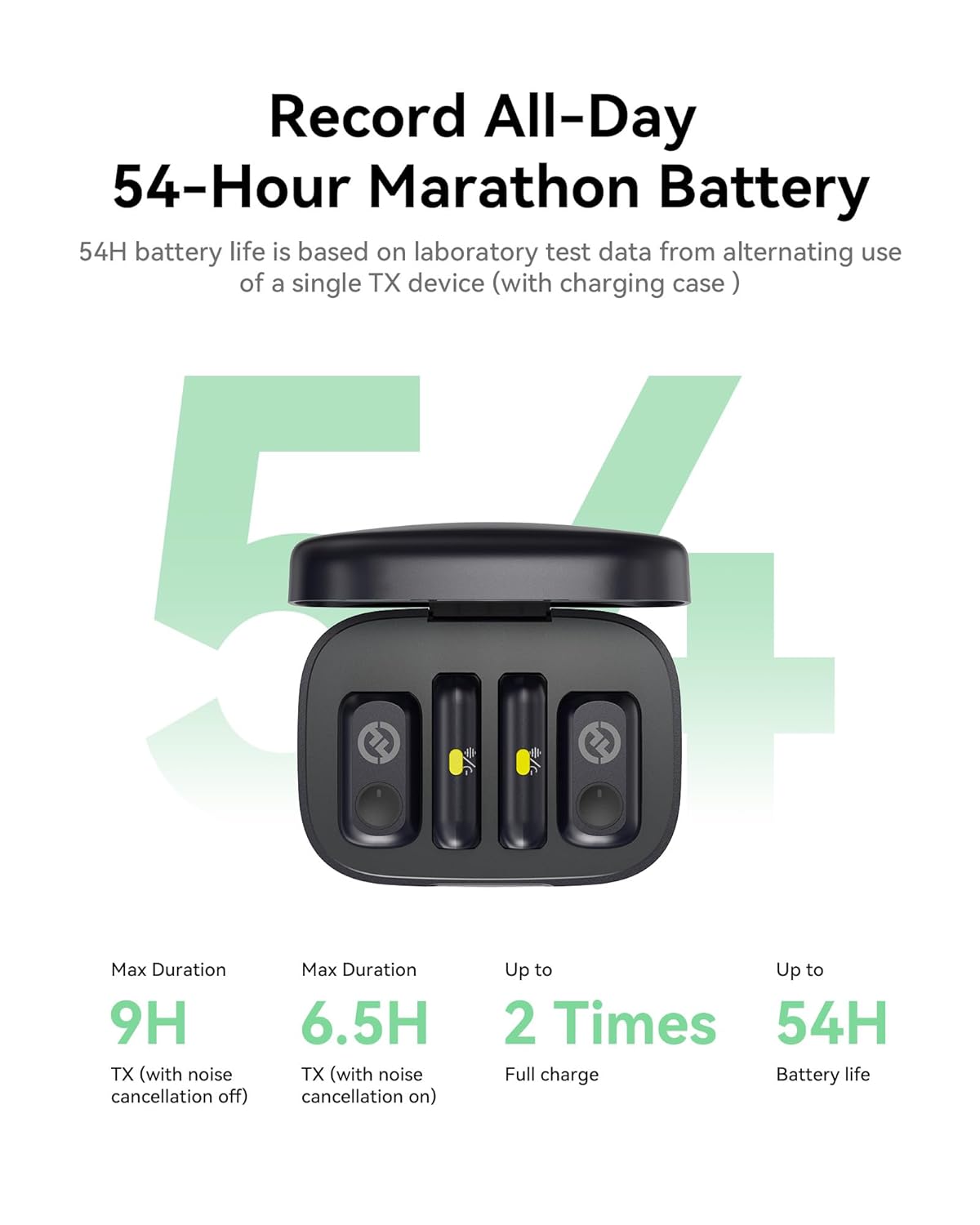 【Up to 54h Battery Life】Achieve up to 54h using 2 transmitter (TX) alternately with the charging case. Create endlessly without battery anxiety.